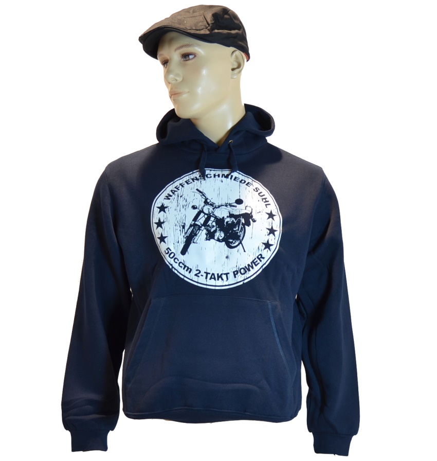 Kapuzensweat Waffenscmiede Suhl, vorn großer Motiv-Druck: - Waffenschmiede Suhl 50ccm 2-Takt Power - abgebildet ist ein Simson S51 Mockick.
