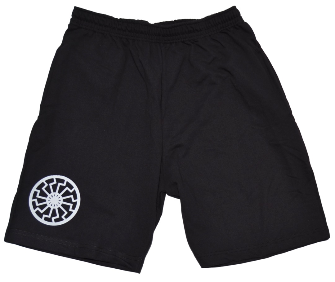 Shorts mit kleinem Motiv-Druck auf rechtem Bein: schwarze Sonne - ; 2 Seitentaschen , dünner sommerlicher Stoff