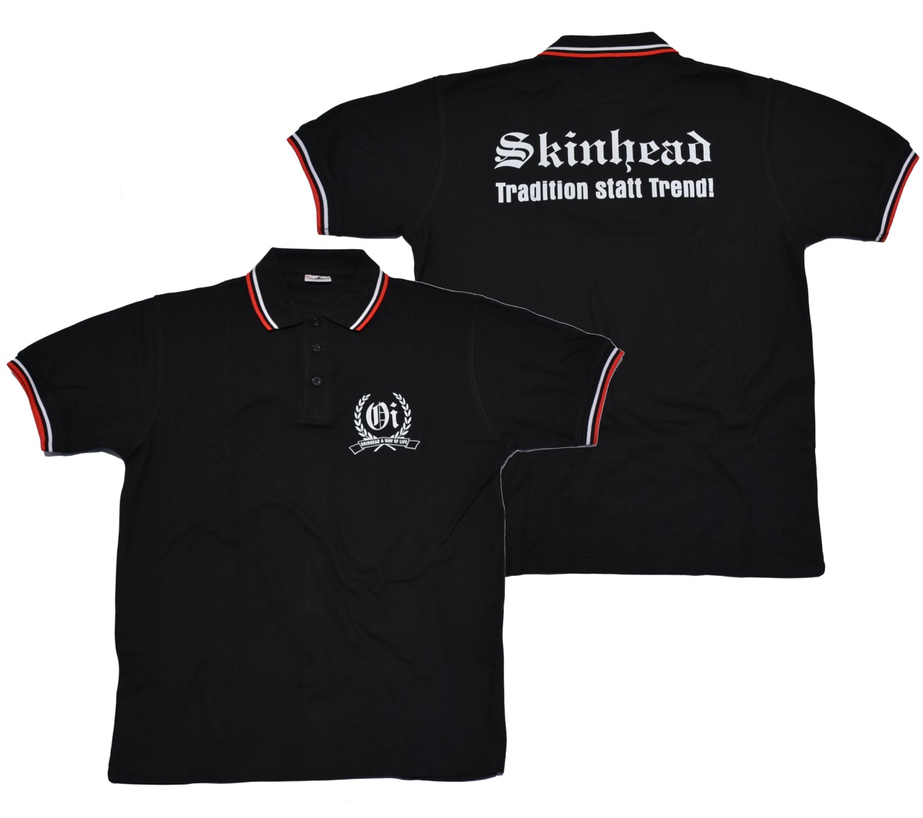Polo-Shirt mit kleinem Motiv-Druck auf linker Brust: - Oi! Skinhead Rock n Roll -; weiße Kontraststreifen