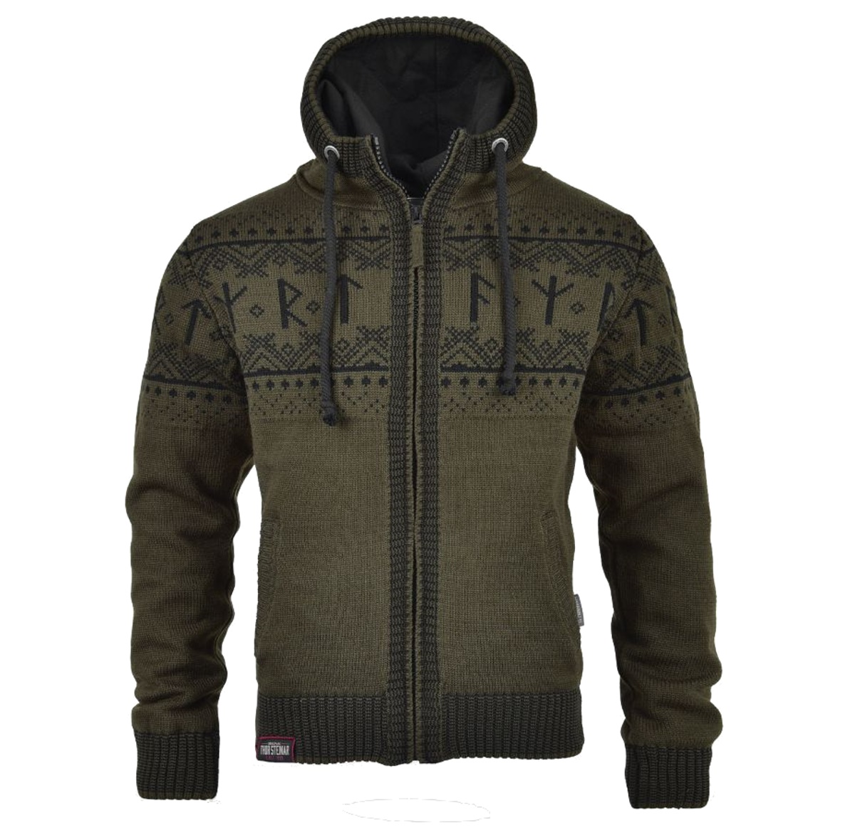 Dick gefütterte Thor Steinar Strickjacke im angesagten traditionellen Norweger-Look und Runen; mit dickem, hochschließendem Reißverschluss am Kragen, Kapuze mit dicken Bändern und gefüttert, Innenfutter mit Windstop-Funktion, doppelt und dreifarbig gearbeitete Saumrippe, am Saum kleiner Aufnäher.