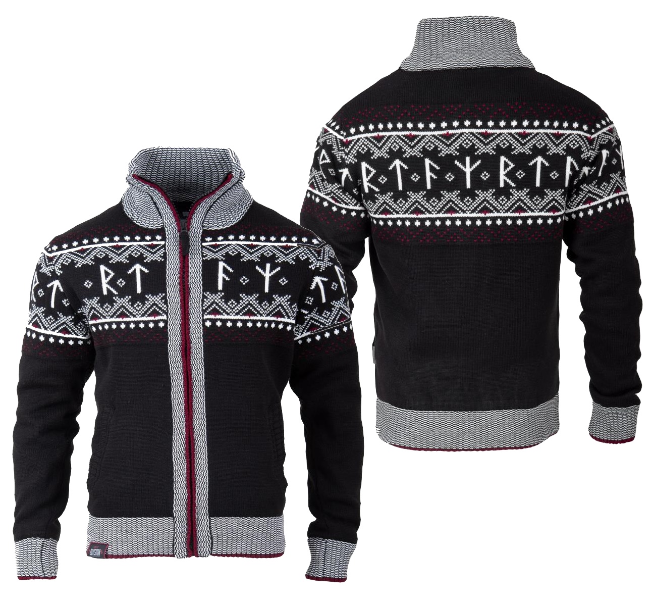 Dicke Thor Steinar Strickjacke im angesagten traditionellen Norweger-Look und Runen; mit dickem, hochschließendem Reißverschluss am Kragen, doppelt und dreifarbig gearbeitete Saumrippe, am Saum kleiner Aufnäher.