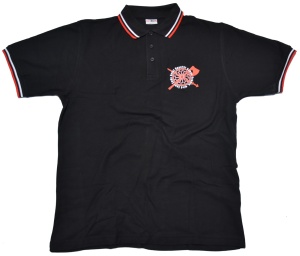Polo Shirt Unser Sonne Schein..., kleiner Motiv-Druck auf linker Brust: - Unserer Sonne Schein, wird euer Ende sein! -; rot/weiße Kontraststreifen.